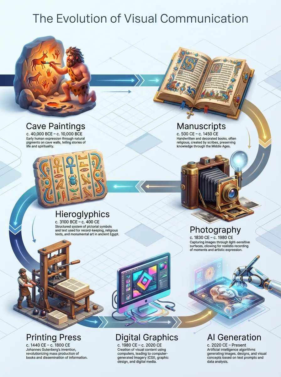- 30,000 BC: Cave paintings in Lascaux, France, served as the first “infographics,” telling stories of hunts and survival through imagery.
