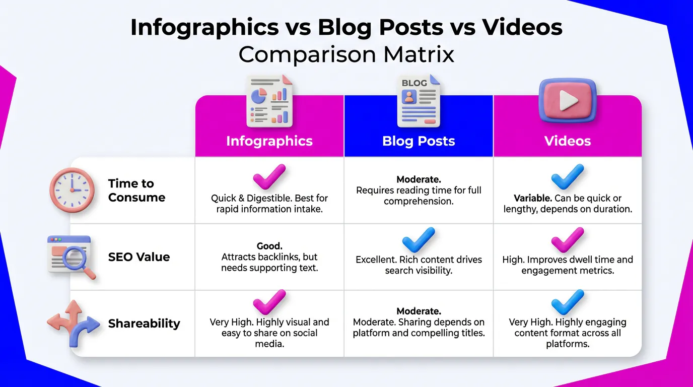 Why should you choose an infographic over a blog post or a video? Here is how they compare in 2026: