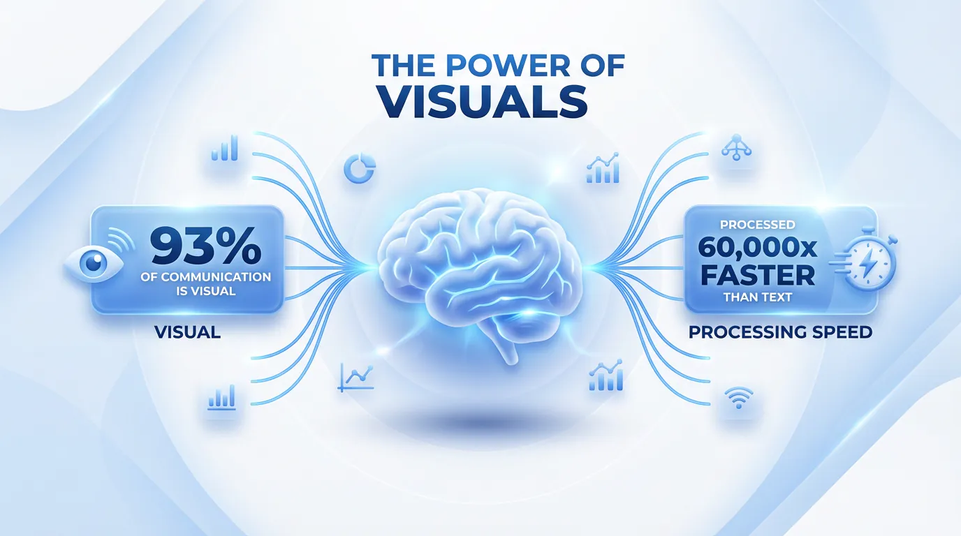 - Speed of Processing: The human brain processes visuals 60,000 times faster than text. While you are still reading this sentence, your brain could have processed a complex chart instantly.
